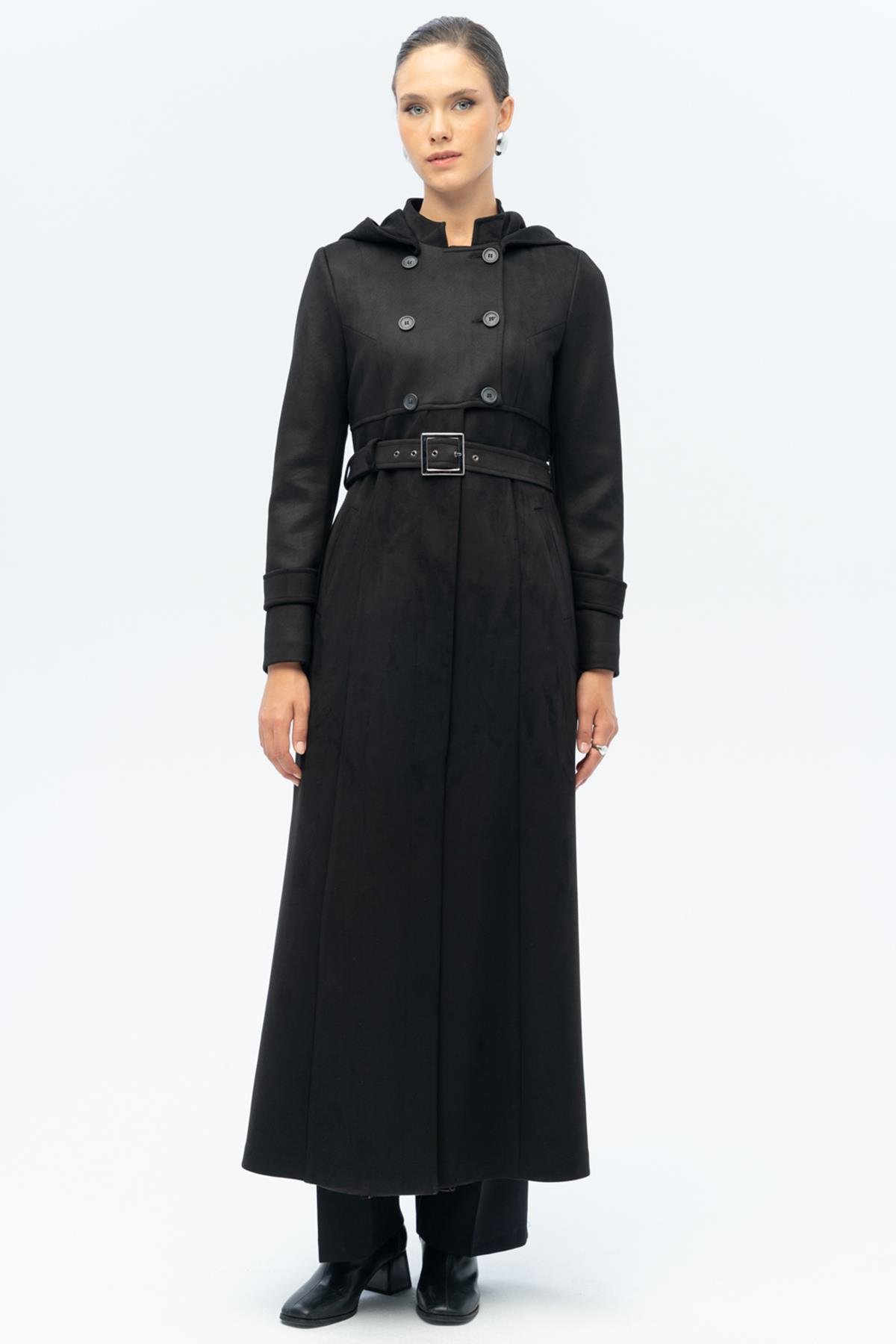 Kapüşonlu Garni Detaylı Süet Görünümlü Pardesü SİYAH 6677