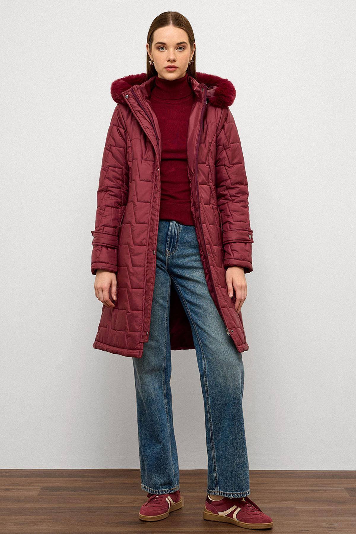 Çıkabilir Kürklü Kapüşonlu Fermuar Kapamalı Kapitone Mont BORDO 6779