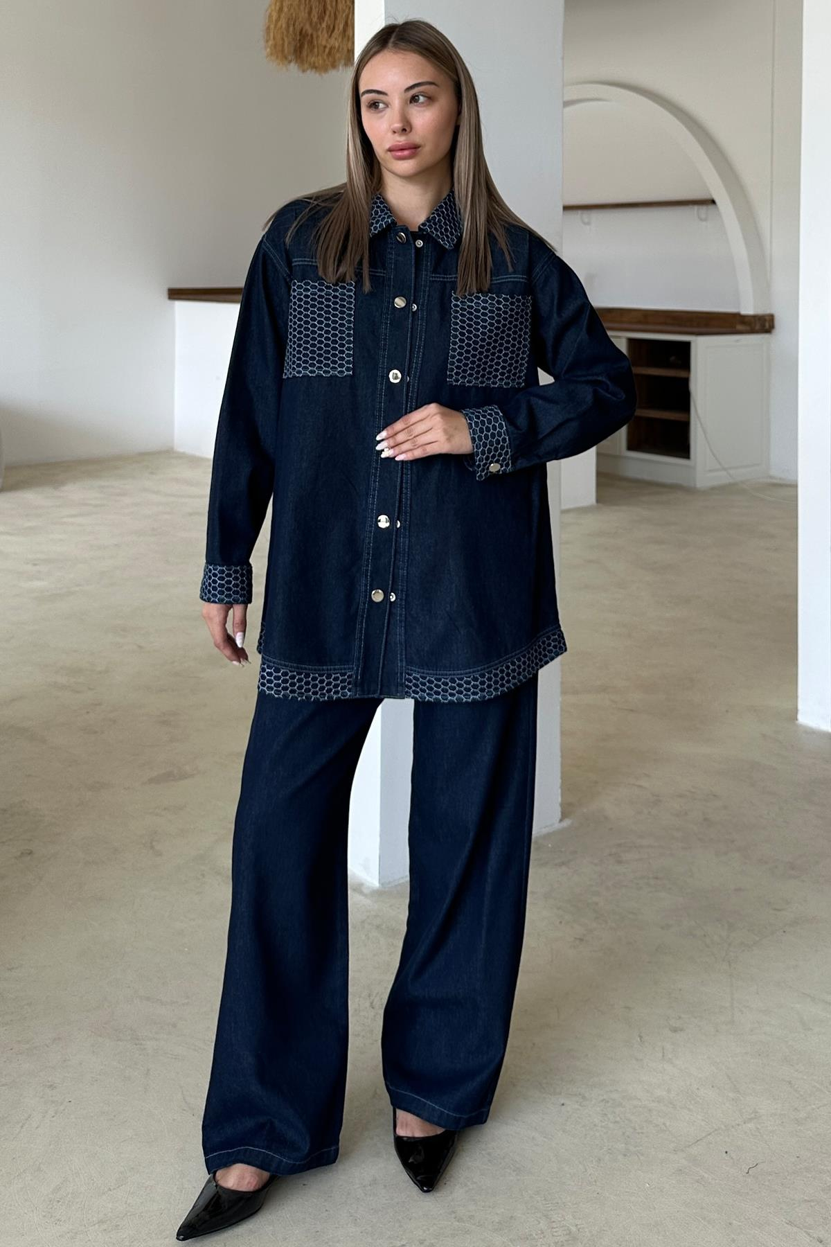 Mankenin üzerindeki ürün ve ölçüleri: S beden. Göğüs: Tunik: 110 cmcm, Bel: Tunik:106 Pantolon:70 cm, Basen: Tunik:114 Pantolon:118cm.