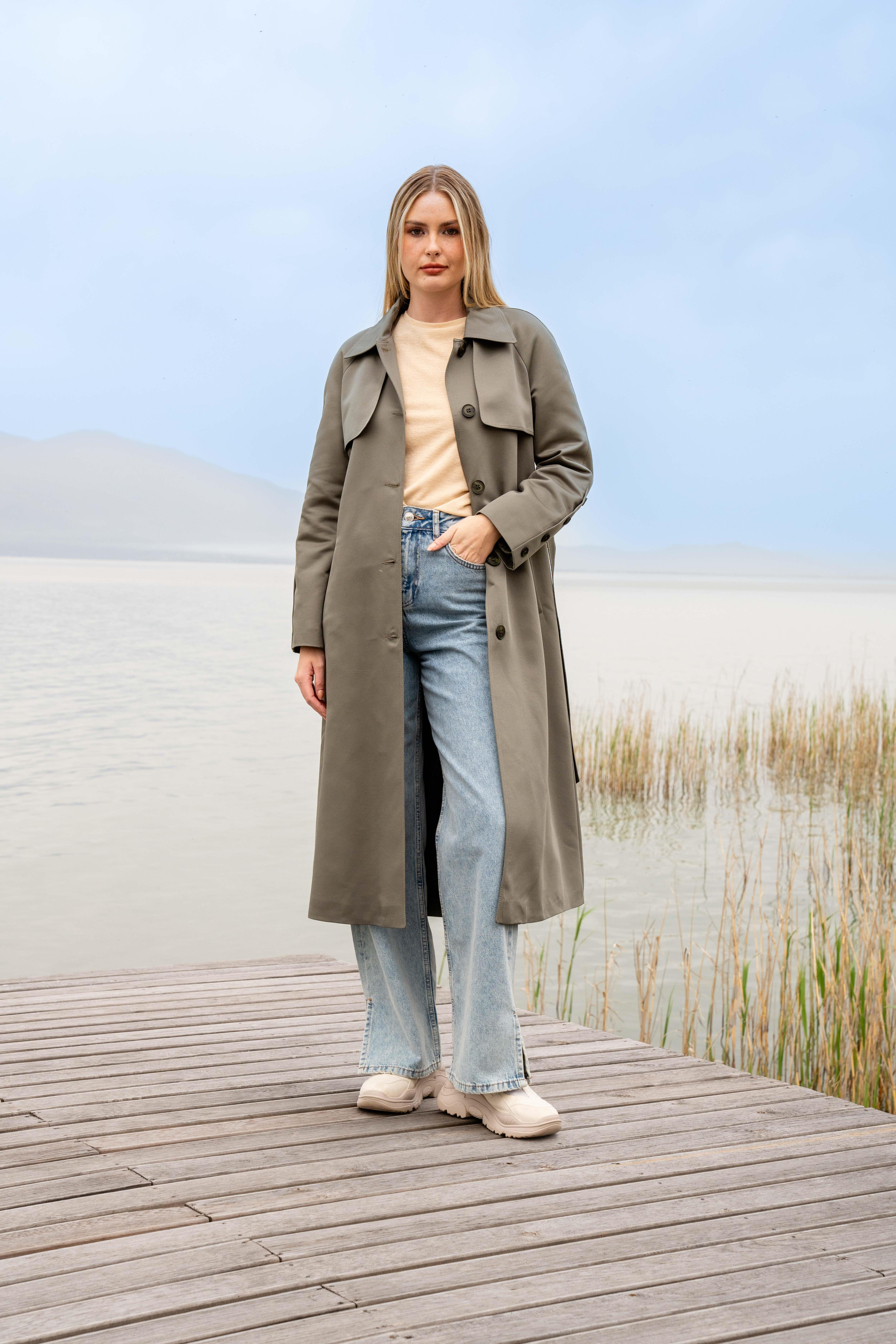 Gömlek Yaka Pelerin Detaylı Reglan Kol Su İtici Özellikli Astarlı Ara Boy Trençkot HAKİ 6530
