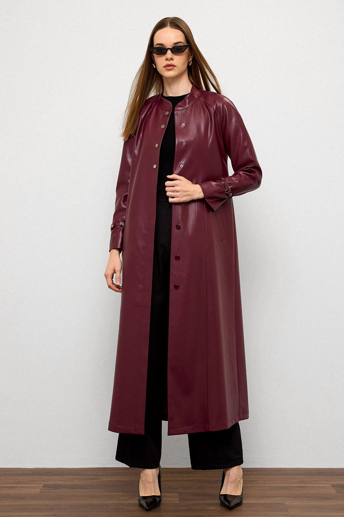 Hakim Yaka Kemer Detaylı Uzun Deri Trençkot BORDO 6775