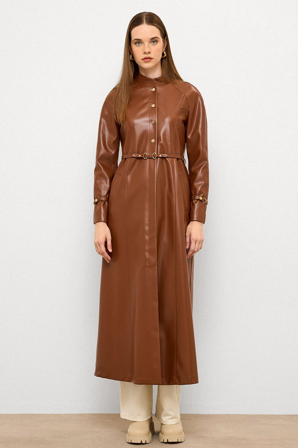 Hakim Yaka Kemer Detaylı Uzun Deri Trençkot TABA 6775