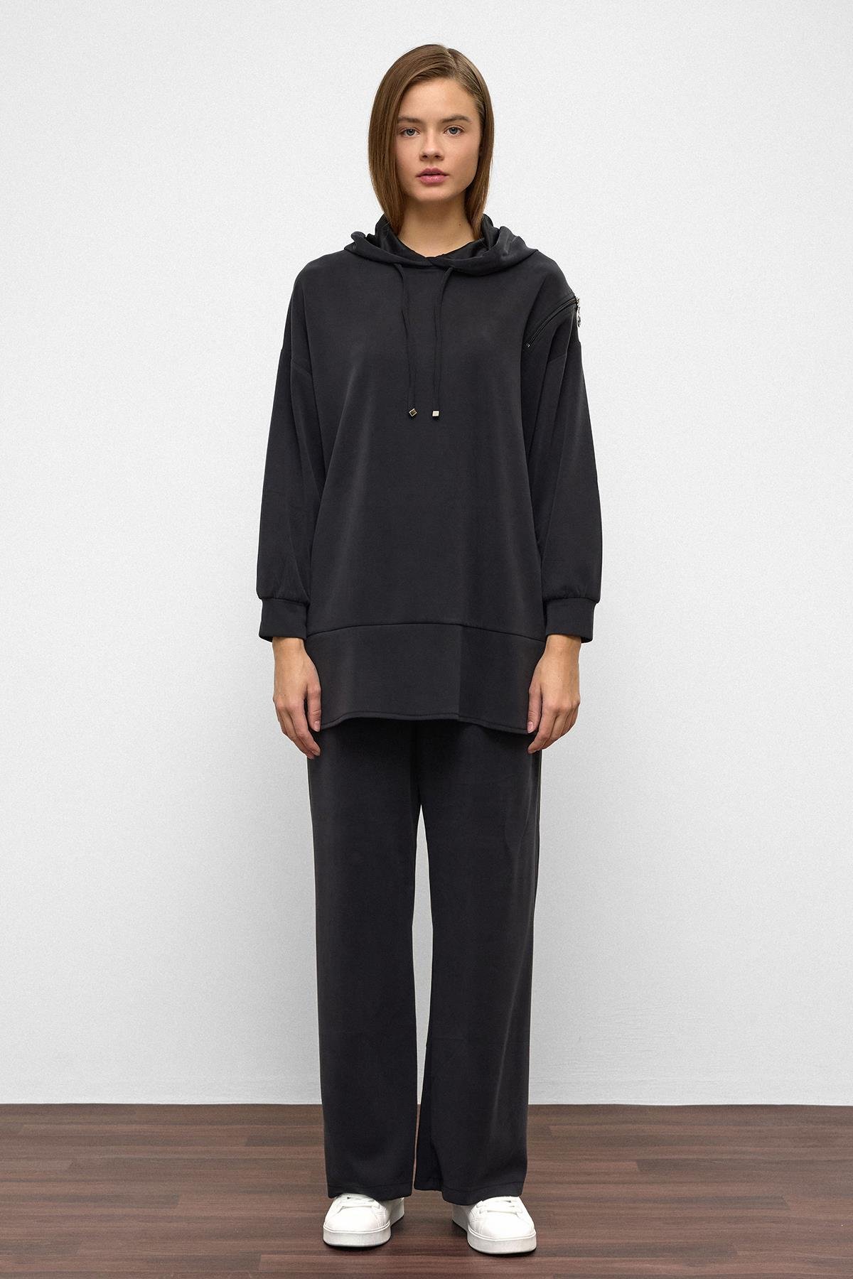 Kapüşonlu Fermuar Aksesuarlı Sweat Pantolon Salaş Modal Takım SİYAH 9382-TK