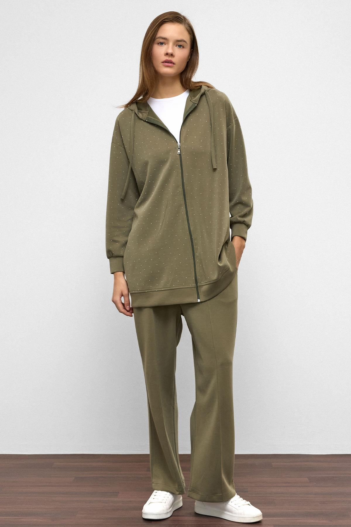 Kapüşonlu Fermuarlı Taş Bezeli Premium Kumaş Sweat Pantolon Takım HAKİ 9371-TK