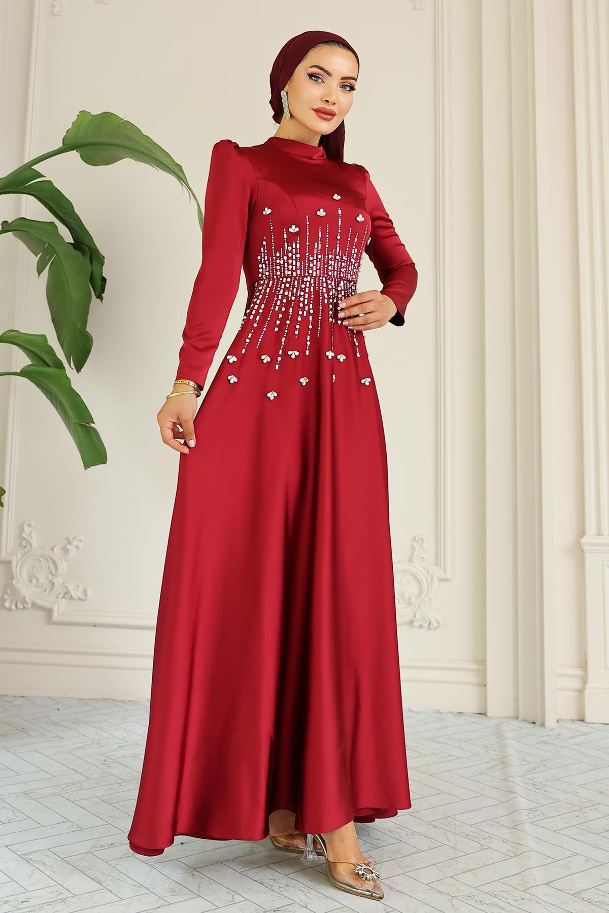 Kloş Önü Taş Desenli Saten Tesettür Abiye Elbise BORDO 1680
