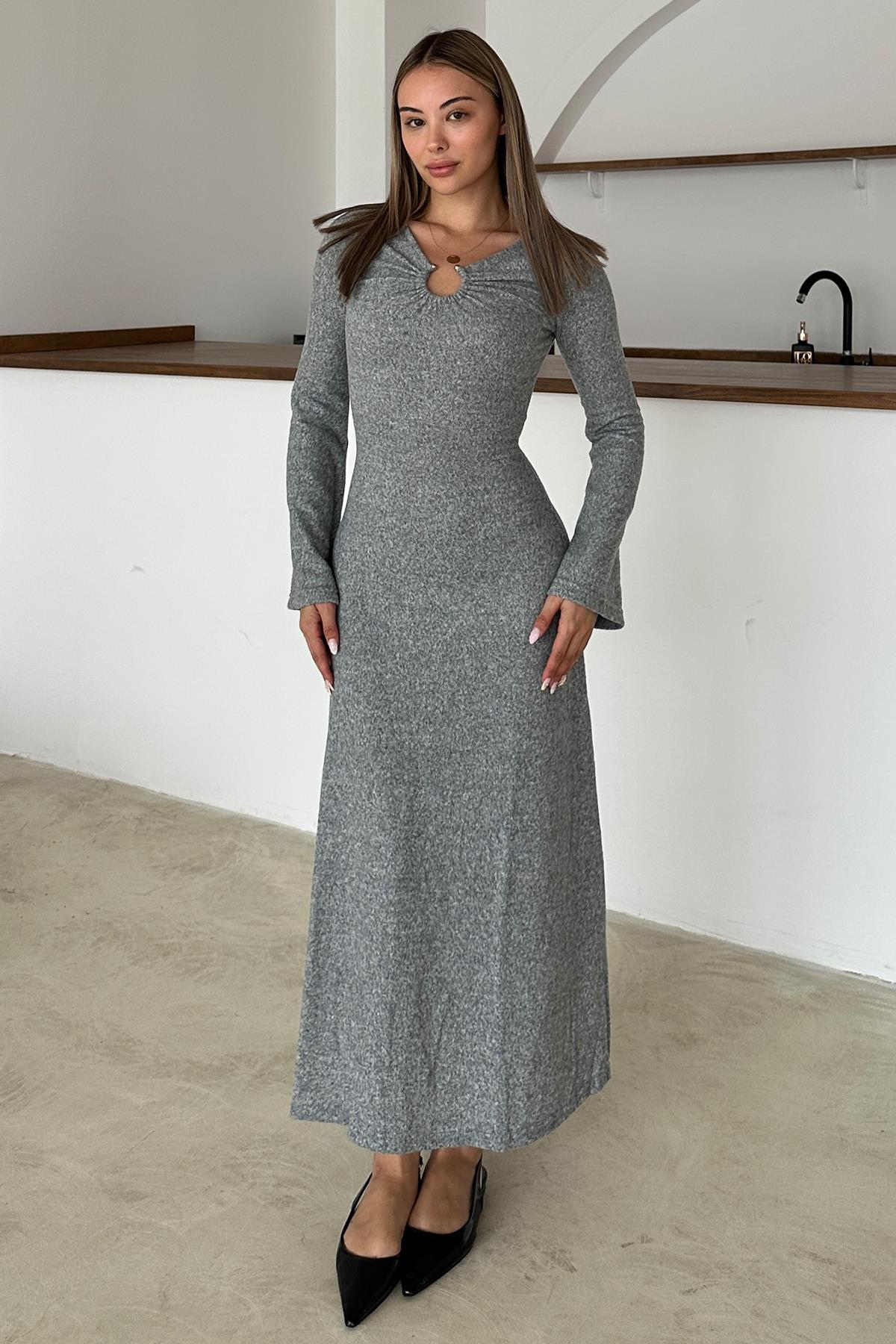 Önü Aksesuarlı Örme Elbise GRİ 9367-E