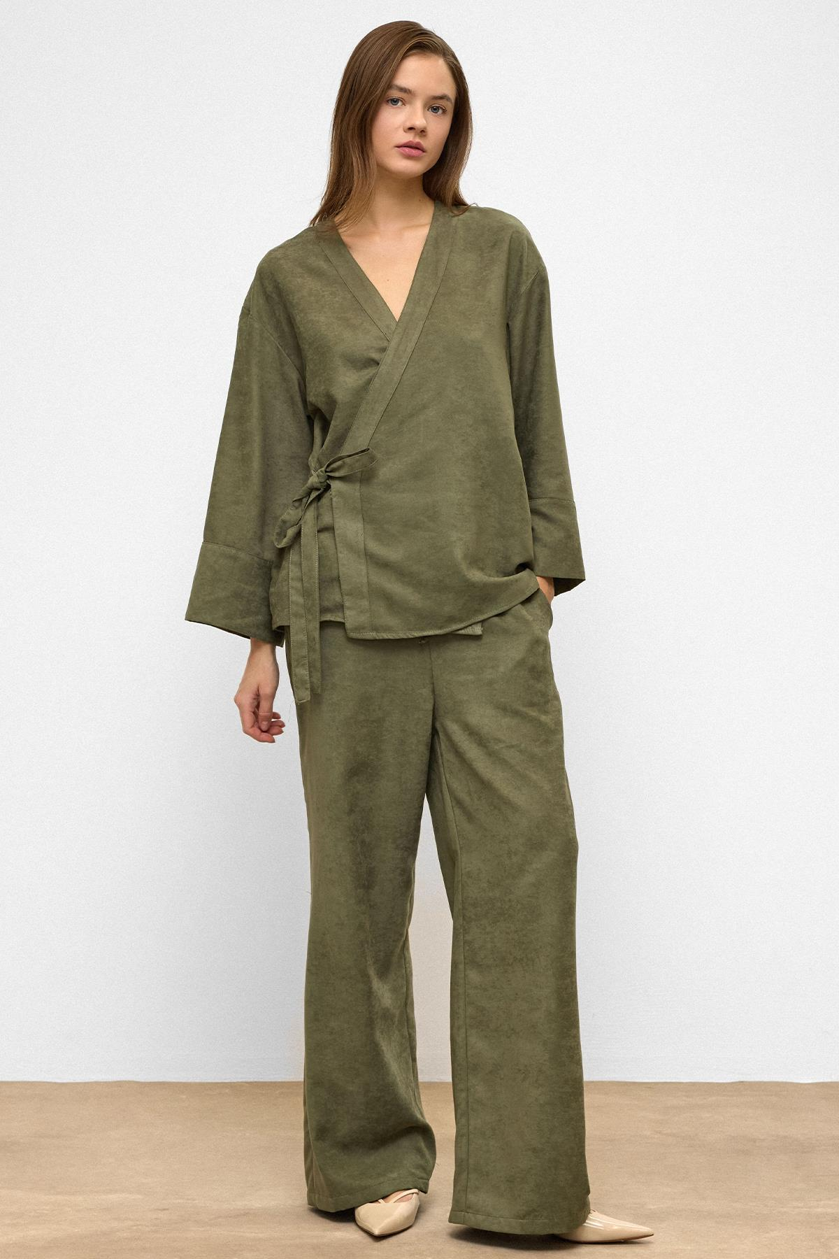 Önü Bağlamalı Süet Görünümlü Kimono İkili Takım HAKİ 9366-TK