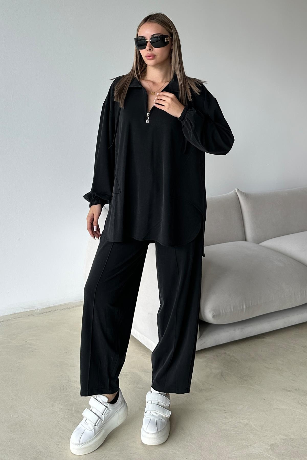 Yakası Fermuar Detaylı Premium Örme Kumaş Tunik Pantolon Takım SİYAH 9375-TK